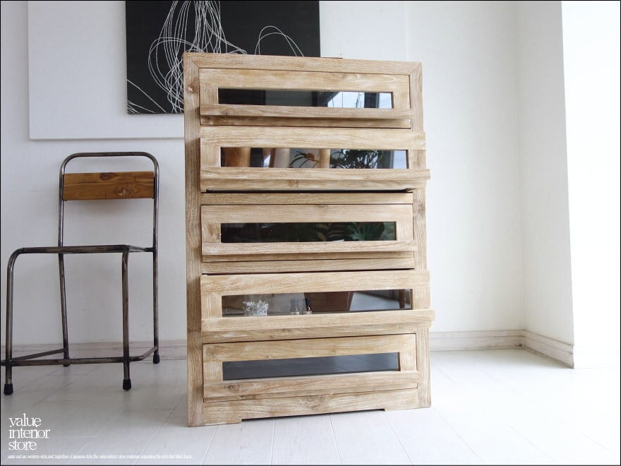 木目の美しいチーク総無垢材の5段キャビネット。引き出しの前面がクリアガラスになっていますのでショーケースのように飾る感覚で収納していただけます。また、表面はワイヤーブラシで軽く削ってから白色を塗布した後に、サイディングする手法を用いていますので、シャビーな質感に仕上がっていて、無垢材の質感を十分に感じさせてくれます。(バリューインテリアストアオリジナル)