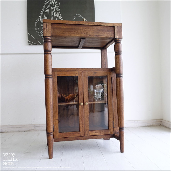 木目の美しいチーク総無垢材のガラスケース。トップのガラスケースは後ろに開閉式で小物を飾っていただけます。