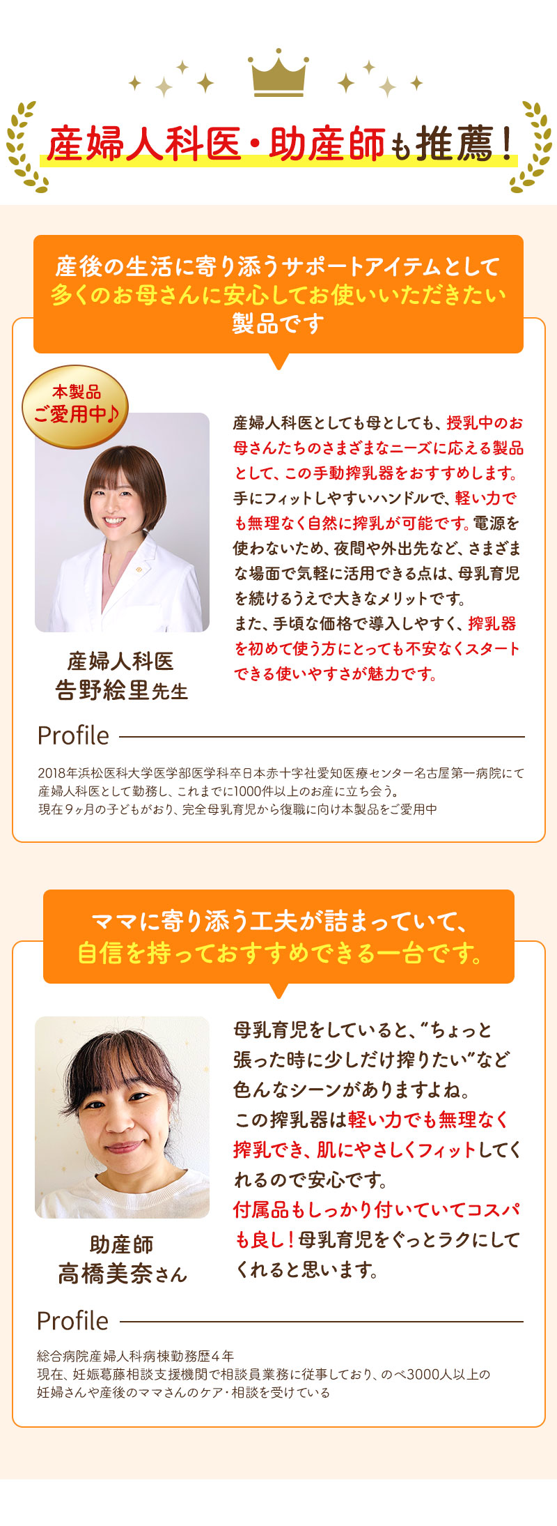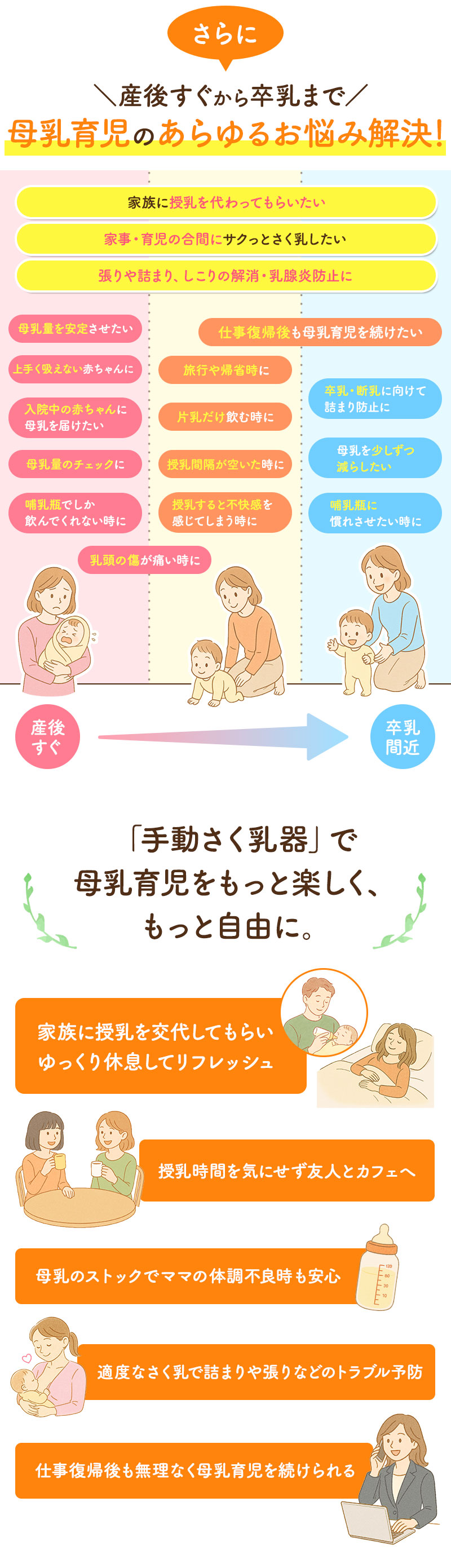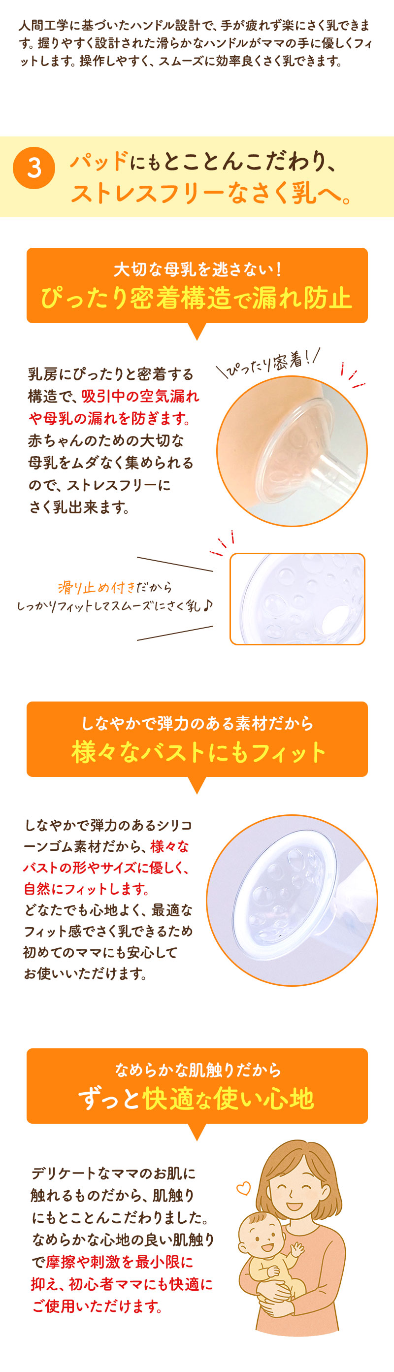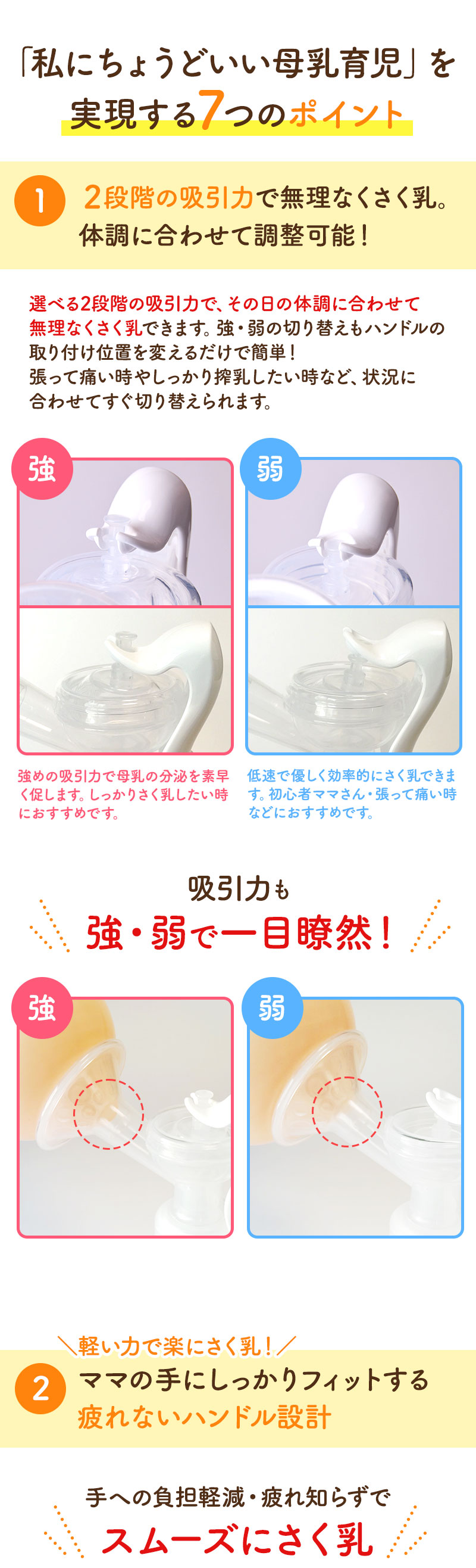【握りやすいハンドル】女性の手に合わせた握りやすいハンドルで楽々搾乳。力が必要ないので長時間の搾乳でも手が痛くなりません。