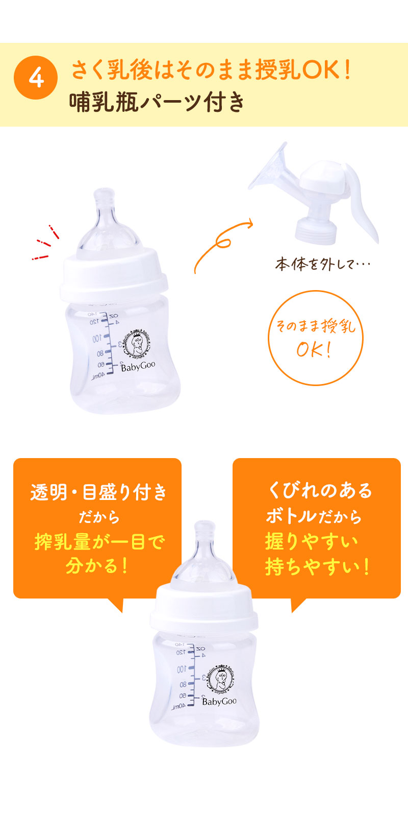 【哺乳瓶として使えます】付属の乳首パーツを取り付けて哺乳瓶としてそのまま銃乳が可能です。母乳を入れ替える必要がなく衛生的で時短!