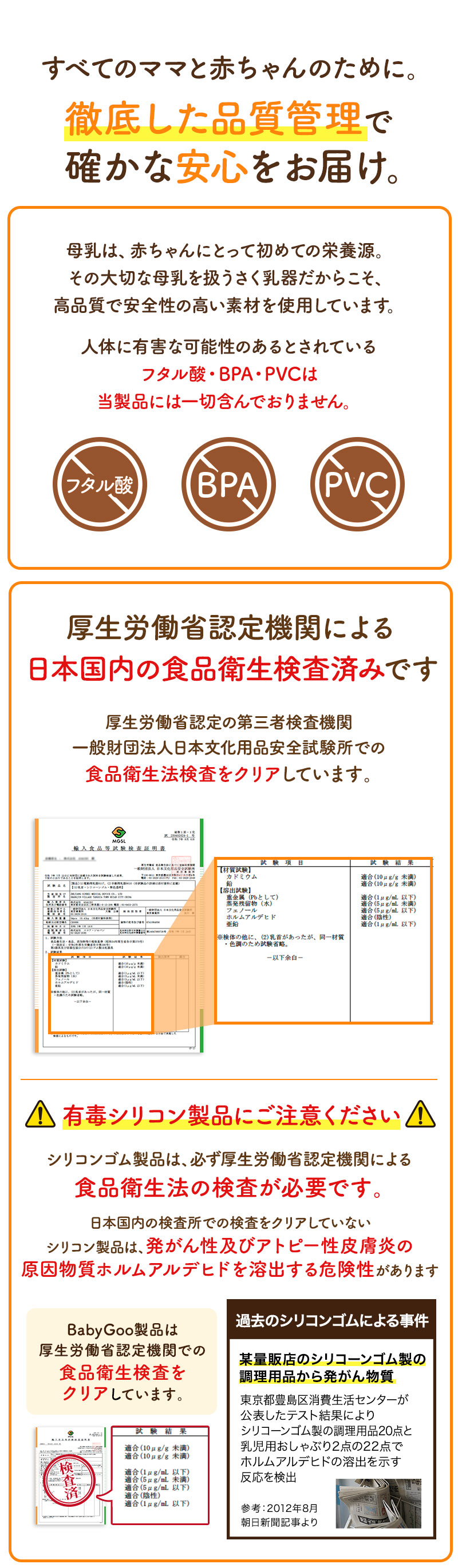 【確かな安全品質】BPAフリー・フタル酸フリー・食品衛生法適合検査クリア済み。赤ちゃんに使うものだから、安心してご使用いただける品質をお約束します。