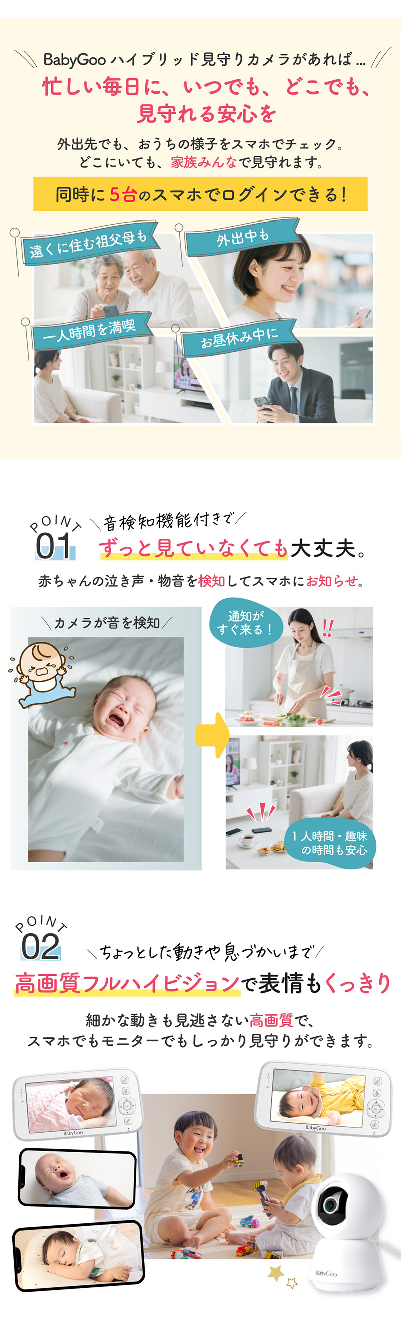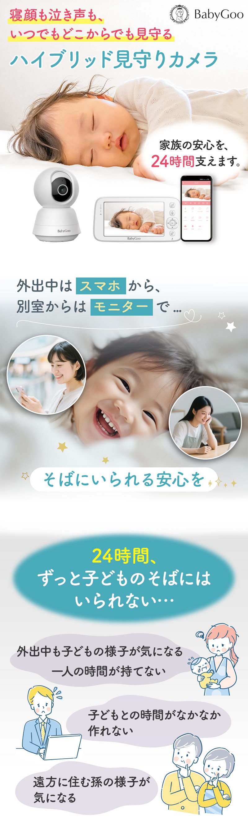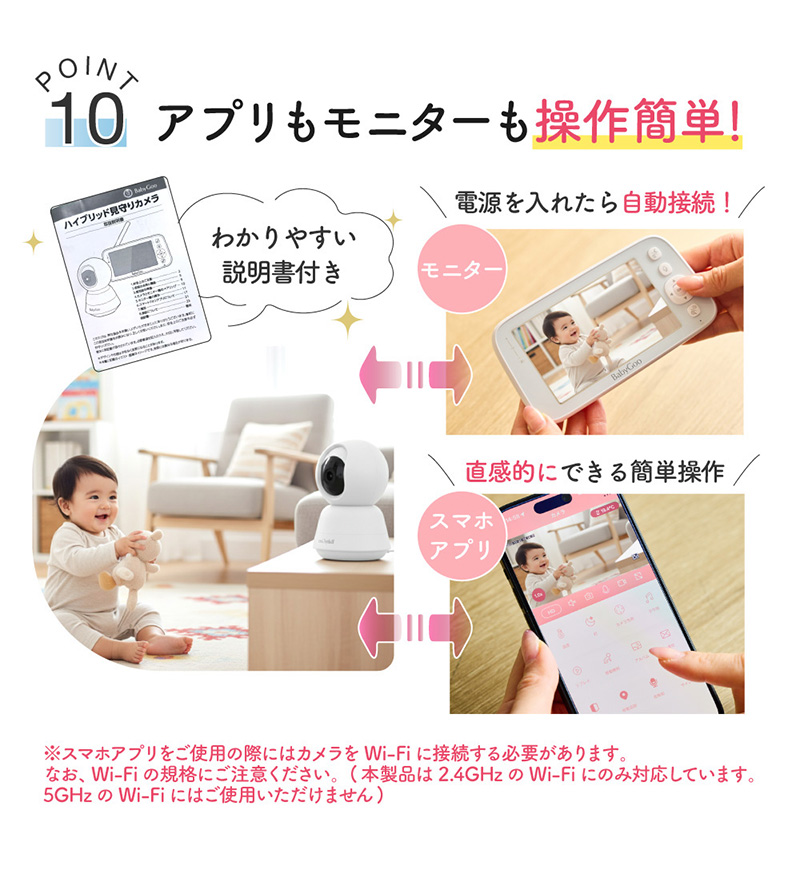 2Way ベビーモニター スマホ&モニター両対応のハイブリッド見守りカメラ フルハイビジョン高画質 危険アラートを素早く察知する安心通知機能付き