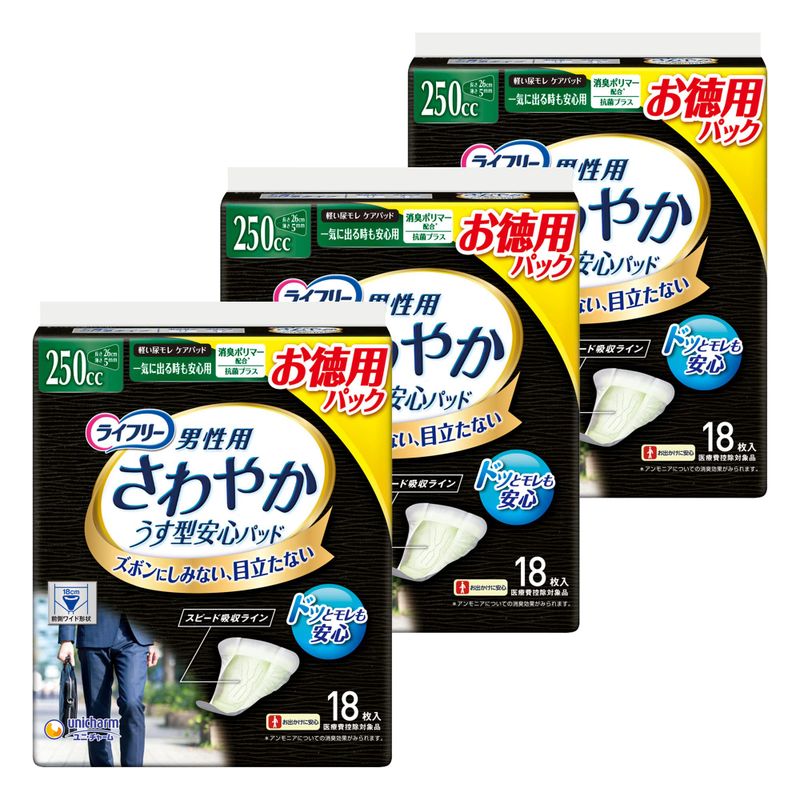 ・男性専用の「ズボンにしみない目立たない」一気に出る時も安心尿モレケアパッド。・吸収量250?。・250?だけの独自の機能としてカップホールド設計、スピード吸収ライン搭載。・基本機能として「前側ワイド形状」で体の前側を幅広くカバー。・「ホールドギャザー」採用ではみだしをガード。・うす型でアウターに響かない。・抗菌シート搭載。・ニオイを閉じ込める消臭ポリマー配合(アンモニアについての消臭効果がみられます)。