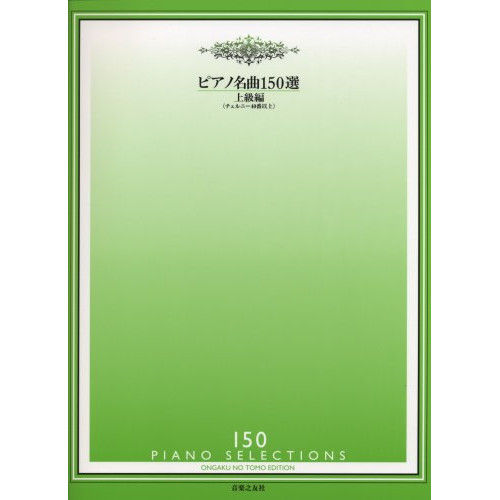 ピアノ名曲150選/上級編(チェルニー40番以上)1 . アリア(「ゴルトベルク変奏曲」より)BWV988/2 . トルコ行進曲(「ピアノ・ソナタ第11番イ長調」より)K.331/3 . 月光(「ピアノ・ソナタ第14番嬰ハ短調」より)op.27-2/4 . 即興曲 op.90-2/D.899/5 . 即興曲 op.140-2/D.935/6 . 別れの曲 op.10-3/7 . 革命のエチュード op.10-12/8 . 幻想即興曲 op.66/9 . 軍隊ポロネーズ op.40-1/10 . 英雄ポロネーズ op.53/11 . 飛翔(「幻想小曲集」より)op.12-2/12 . 愛の夢 第3番/13 . ラ・カンパネッラ(「パガニーニよる大練習曲」より)/14 . ハンガリー舞曲第5番/15 . ラプソディ op.79-2/16 . 間奏曲(「6つの小品」より)op.118-2/17 . 月の光(「ベルガマスク組曲」より)/18 . 村の踊り(「10の絵画的小品」より)/19 . メイプルリーフ・ラグ/20 . ブレジェイロ/21 . 前奏曲「鐘」(「幻想的小品集」より)op.3-2/22 . 亡き王