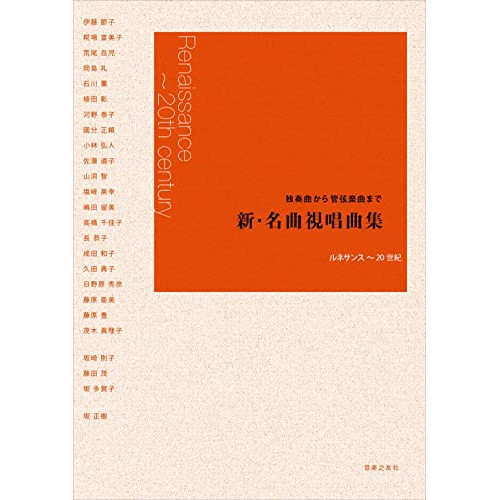 新・名曲視唱曲集1 . モテット『鹿が谷川の水をもとめるように』/2 . ほら、なんと楽しいこだまが(エコーカノン)/3 . 歌劇『オルフェオ』より~第1幕合唱の場/4 . オルドル第1番より~第1クーラント/5 . ヴァイオリン協奏曲『四季』より~「冬」 ラルゴ/6 . 音楽の捧げ物より~3声のリチェルカーレ/7 . トランペット協奏曲より~第2楽章/8 . フルート四重奏曲第1番より~第2楽章/9 . レクイエムより~キリエ/10 . ヴァイオリン協奏曲より~第3楽章/11 . 交響曲第8番『ザグレイト』より~第3楽章スケルツォ/12 . 幻想交響曲より~第4楽章「断頭台への行進」/13 . ピアノ協奏曲第1番より~第2楽章/14 . 交響曲第3番『ライン』より~第1楽章/15 . 楽劇『トリスタンとイゾルデ』より~第1幕前奏曲/16 . レクイエムより~涙の日/17 . 交響曲第3番より~第3楽章/18 . 歌劇『イーゴ