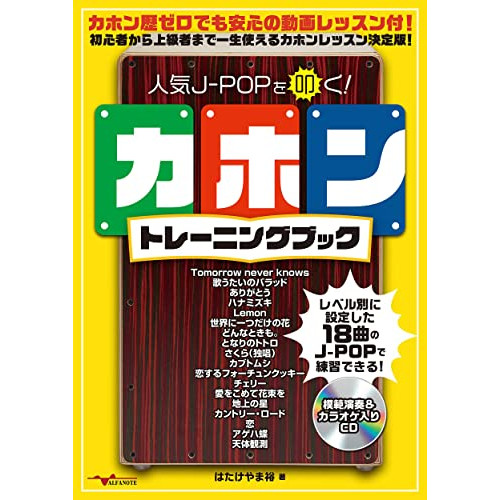 人気J-POPを叩く!カホントレーニングブック(CD2枚付)(音楽書)1 . Tomorrow never knows/2 . 歌うたいのバラッド/3 . ありがとう/4 . ハナミズキ/5 . Lemon/6 . 世界に一つだけの花/7 . どんなときも。/8 . となりのトトロ/9 . さくら(独唱)/10 . カブトムシ/11 . 恋するフォーチュンクッキー/12 . チェリー/13 . 愛をこめて花束を/14 . 地上の星/15 . カントリー・ロード/16 . 恋/17 . アゲハ蝶/18 . 天体観測/