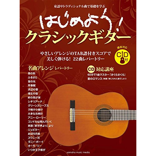 はじめよう!クラシックギター(CD付)1 . さくらさくら/2 . 愛のロマンス/3 . 里の秋/4 . ふるさと/5 . 蛍の光/6 . 早春賦/7 . 浜辺の歌/8 . 埴生の宿/9 . 峠の我が家/10 . シチリアーナ/11 . グリーンスリーブス/12 . 夕焼け小焼け/13 . 大きな古時計/14 . アニー・ローリー/15 . コンドルは飛んでいく/16 . 家路「新世界」より/17 . ジュピター/18 . おぼろ月夜/19 . スワニー河/20 . ダニー・ボーイ/21 . オーラ・リー/22 . いつか王子様が/
