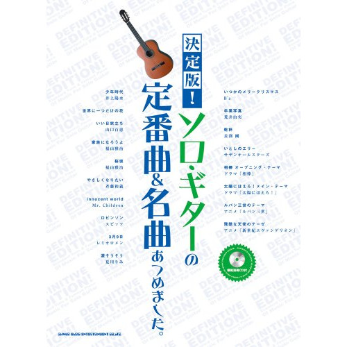 決定版!ソロ・ギターの定番曲&名曲あつめました。(模範演奏CD付)1 . 少年時代(井上陽水)/2 . 世界に一つだけの花/3 . いい日旅立ち(山口百恵)/4 . 家族になろうよ(福山雅治)/5 . 桜坂(福山雅治)/6 . やさしくなりたい(斉藤和義)/7 . innocent world(Mr.Children)/8 . ロビンソン(スピッツ)/9 . 3月9日(レミオロメン)/10 . 涙そうそう(夏川りみ)/11 . いつかのメリークリスマス(B'z)/12 . 卒業写真(荒井由実)/13 . 乾杯(長渕 剛)/14 . いとしのエリー(サザンオールスターズ)/15 . 相棒 オープニング・テーマ(ドラマ「相棒」)/16 . 太陽にほえろ!メイン・テーマ(ドラマ「太陽にほえろ!」/17 . ルパン三世のテーマ(アニメ「ルパン三世」)/18 . 残酷な天使のテーゼ(アニメ「新世紀エヴァンゲリオン」)/
