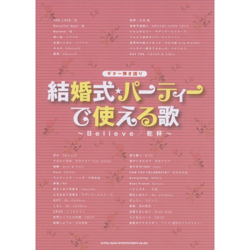 結婚式★パーティーで使える歌!~Believe/乾杯~1 . ONE LOVE/2 . BEAUTIFUL DAYS/3 . BELIEVE/4 . 赤い糸/5 . 永遠にともに/6 . キセキ/7 . 愛唄/8 . 歩み/9 . そばにいるね/10 . 指輪/11 . PURE/12 . ウェディング・ソング/13 . 未来/14 . 愛をこめて花束を/15 . 心を込めて花束を/16 . GIFT/17 . しるし/18 . 3月9日/19 . 世界に一つだけの花/20 . 結婚しようよ/21 . ■簡易ギター弾き語り譜/22 . 乾杯/23 . 未来予想図II/24 . いとしのエリー/25 . てんとう虫のサンバ/26 . 世界中の誰よりきっと/27 . バンザイ~好きでよかった/28 . SAY YES/29 . 愛は勝つ/30 . 君がいるだけで/31 . 夏の日の1993/32 . CAN YOU CELEBRATE?/33 . EVERYTHING/34 . BEST FRIEND/35 . ハナミズキ/36 . 抱きしめたい/37 . チェリー/38 . 桜坂/39 . 全部だきしめて/40 . らいおんハート/41 . 創聖のアクエリオン/