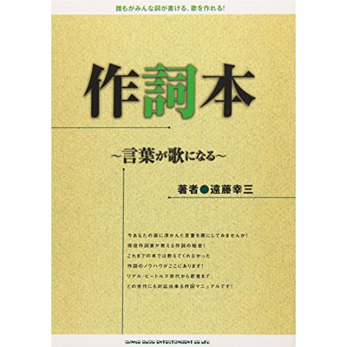 作詞本~言葉が歌になる~(音楽書)1 . 【第1章 街は言葉であふれている すぐそばにある言葉が名曲を作る】/2 . 平凡な人ほどいい詞を書く/3 . 自分の言葉で詞を書けというけれど自分の言葉っていったい何?/4 . ただの言葉が歌詞になる時代/5 . アナウンサーから学ぶ作詞/6 . ヒーロー(ヒロイン)から学ぶ作詞/7 . スタンダード曲から学ぶ作詞/8 . 【第2章 作曲家と作詞家】/9 . 言葉のダイエット法/10 . 先発、中継ぎ、勝負は抑え/11 . 曲先作詞/12 . 作曲家はこう考える!/13 . 【第3章 ボーカリストと作詞家】/14 . ボーカリストが歌いたい歌と歌いたくない歌/15 . 主語はいつもボーカリスト/16 . 音としての言葉/17 . 携帯メール作詞法/18 . 寅さんに見る日本語ラップお原点/19 . 【第4章 リスナーと作詞家と時代】/20 . リスナーの歌の聴き方/21 . 嫌われる
