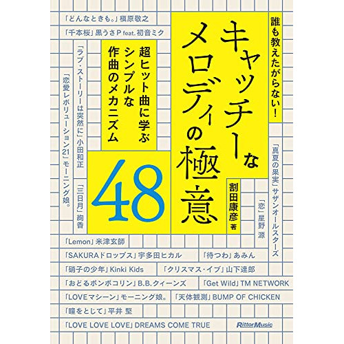 誰も教えたがらない!キャッチーなメロディの極意48(音楽書)1 . 第1章 反復の技法1/2 . Lesson 01 「どんなときも。」/3 . 極意01 単純反復/4 . 極意02 単純反復+味変の術/5 . 極意03 メロディの反復には言葉の反復を/6 . 極意04 情報を盛り込みすぎることなかれ/7 . 極意05 作曲者の主張 × 主人公の意思/主張 = パワーフレーズ/8 . 極意06 反復は〈キャッチー〉への近道である/9 . Lesson 02 「待つわ」/10 . 極意07 スライド反復(完全平行移動型)/11 . 極意08 スライド反復(オカズ違い)/12 . 極意09 〈安住〉と〈刺激〉の法則/13 . 極意10 美味しいメロも三度まで/14 . 極意11 重役出勤型ハモ/15 . 極意12 繰り返しは飽きさせない程度に/16 . Lesson 03 「ラブ・ストーリーは突然に」/17 . 極意14 小田忍法〈カラクリ二重反復〉の術/18 . 極意15 高圧系〈不完全終止〉の術/19 .