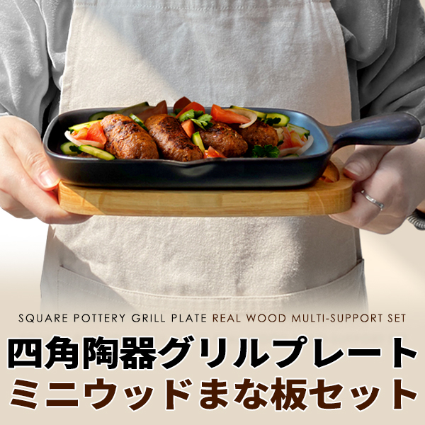 四角陶器グリルプレート+ミニウッドまな板セット 木製 21.5cm 木製まな板 グリル プレート 小型 小さめ ソロ キャンプ 取っ手 軽量 おしゃれ 宅急便