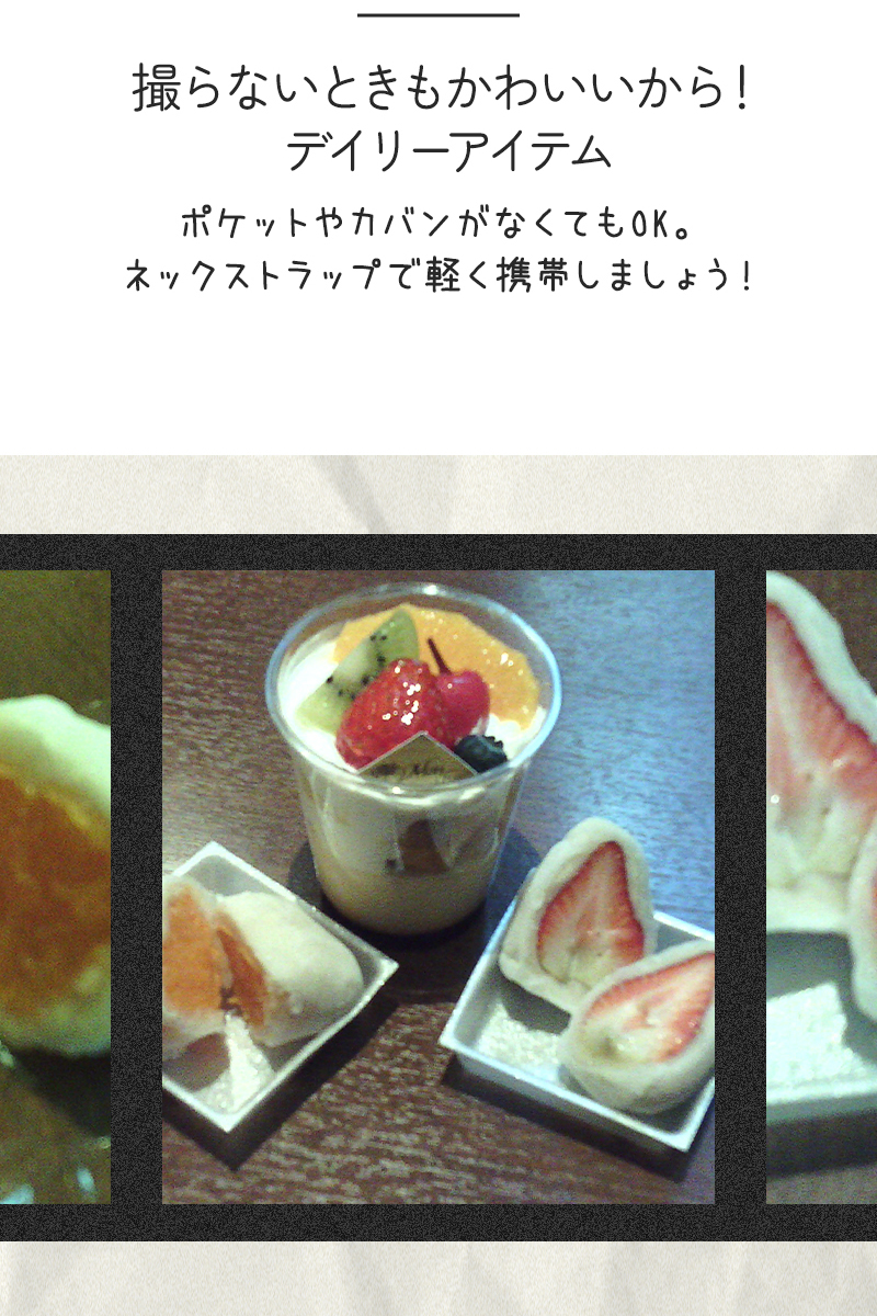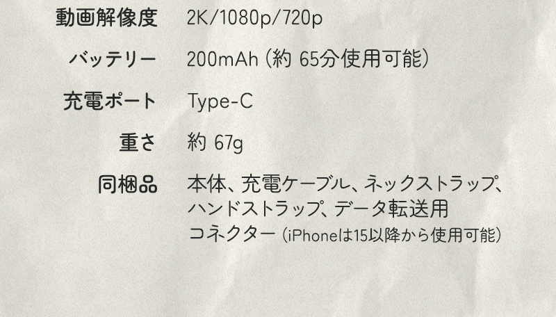 同梱品:本体、充電ケーブル、ネックストラップ、ハンドストラップ、データ転送用コネクター(android)