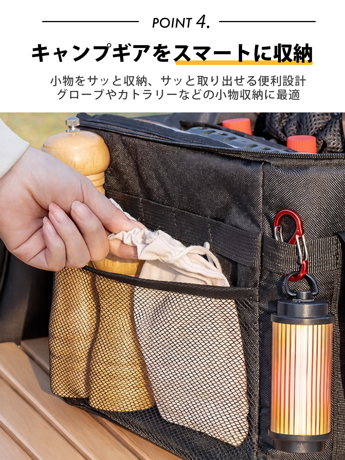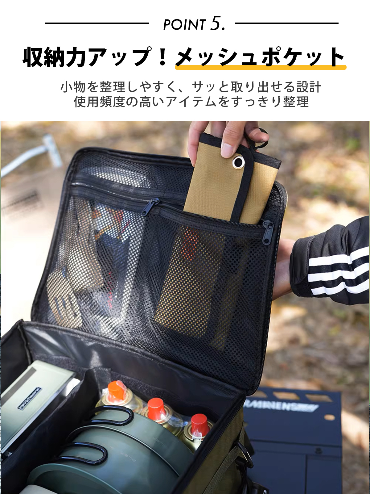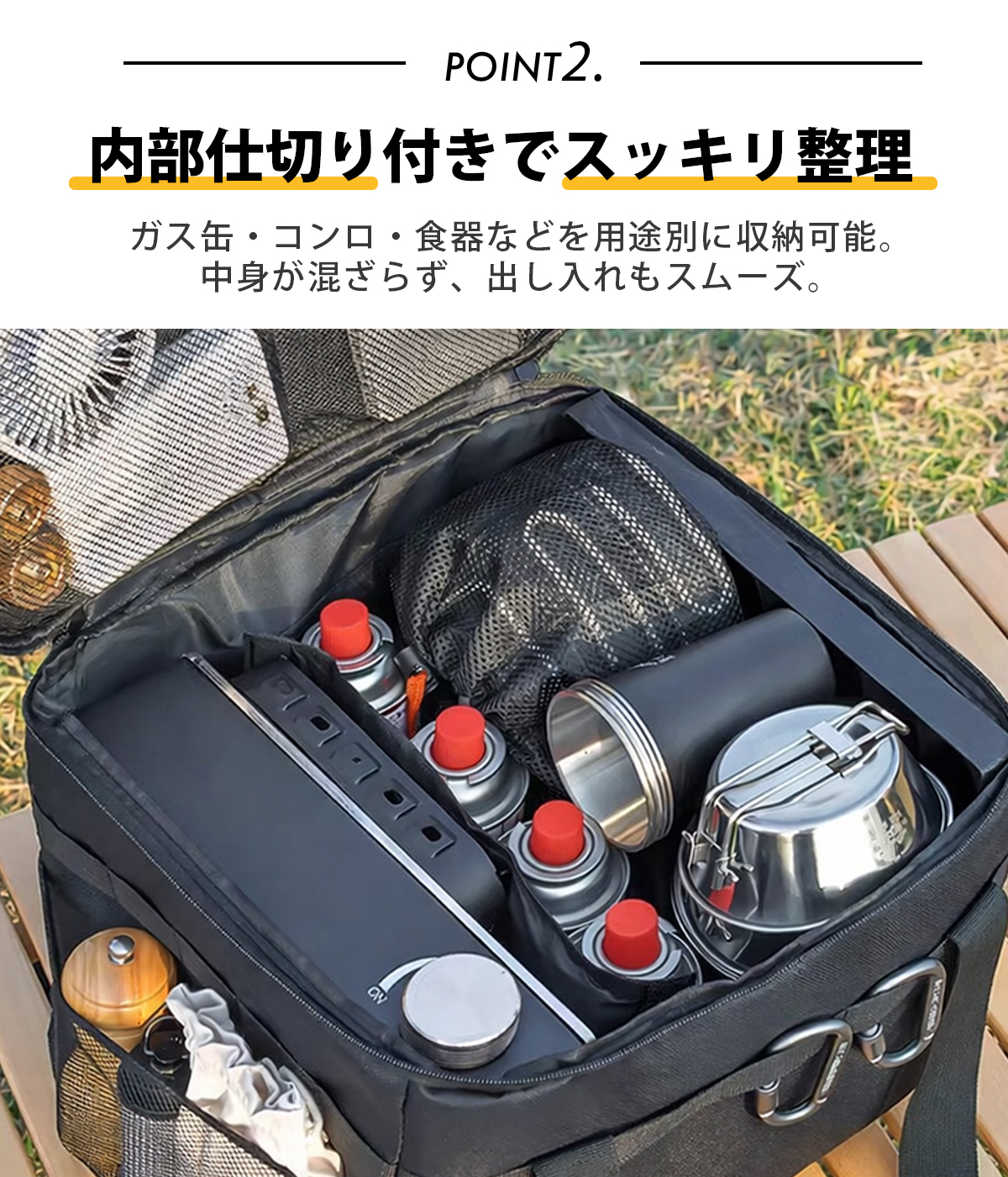 ガス缶・コンロ・食器などを用途別に整理でき、出し入れもスムーズ。