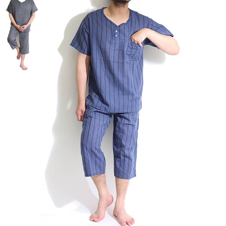 ・夏のメンズ ルームウエア上下組み 先染め(綿100 しじら織り)セット (半袖ポケット付きヘンリーネックシャツと7分丈ステテコパンツの上下セット)