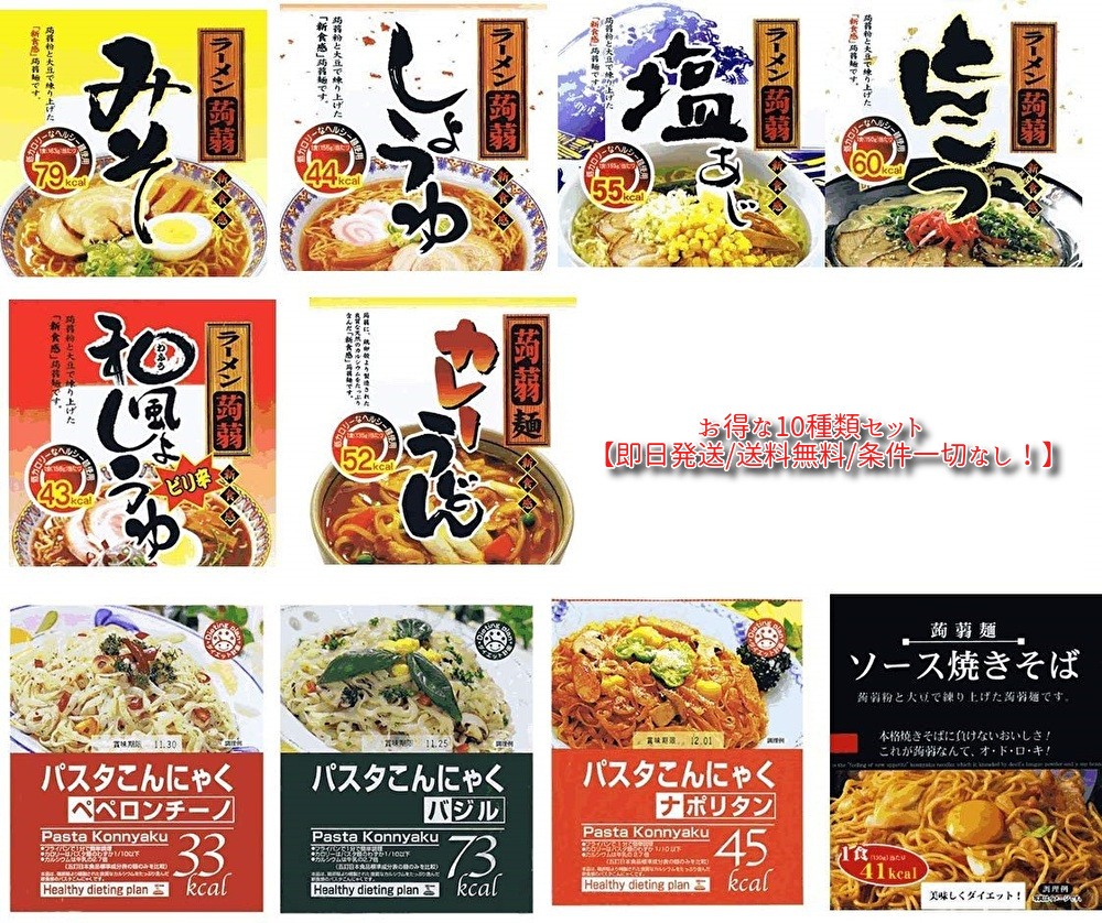 こんにゃくラーメン こんにゃくパスタ 蒟蒻麺 お試し セット 10食分 即日発送 送料無料 条件一切なし!