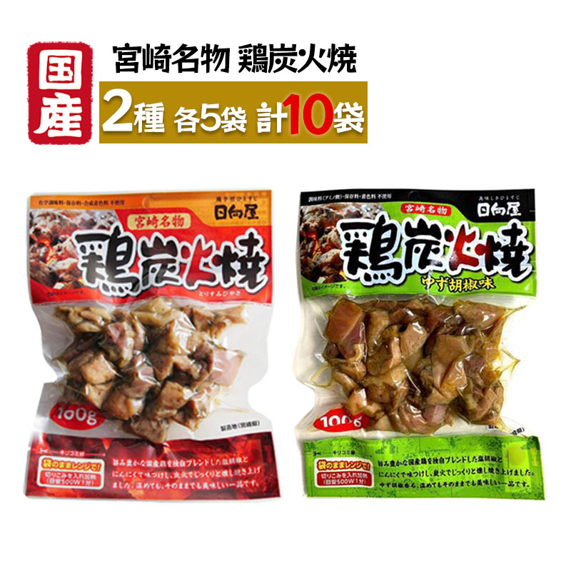 日向屋 宮崎名物 鶏炭火焼 100g×5袋+鶏炭火焼 ゆず胡椒味 90g×5袋 セット 国産 焼き鳥 おつまみ おかず レトルト