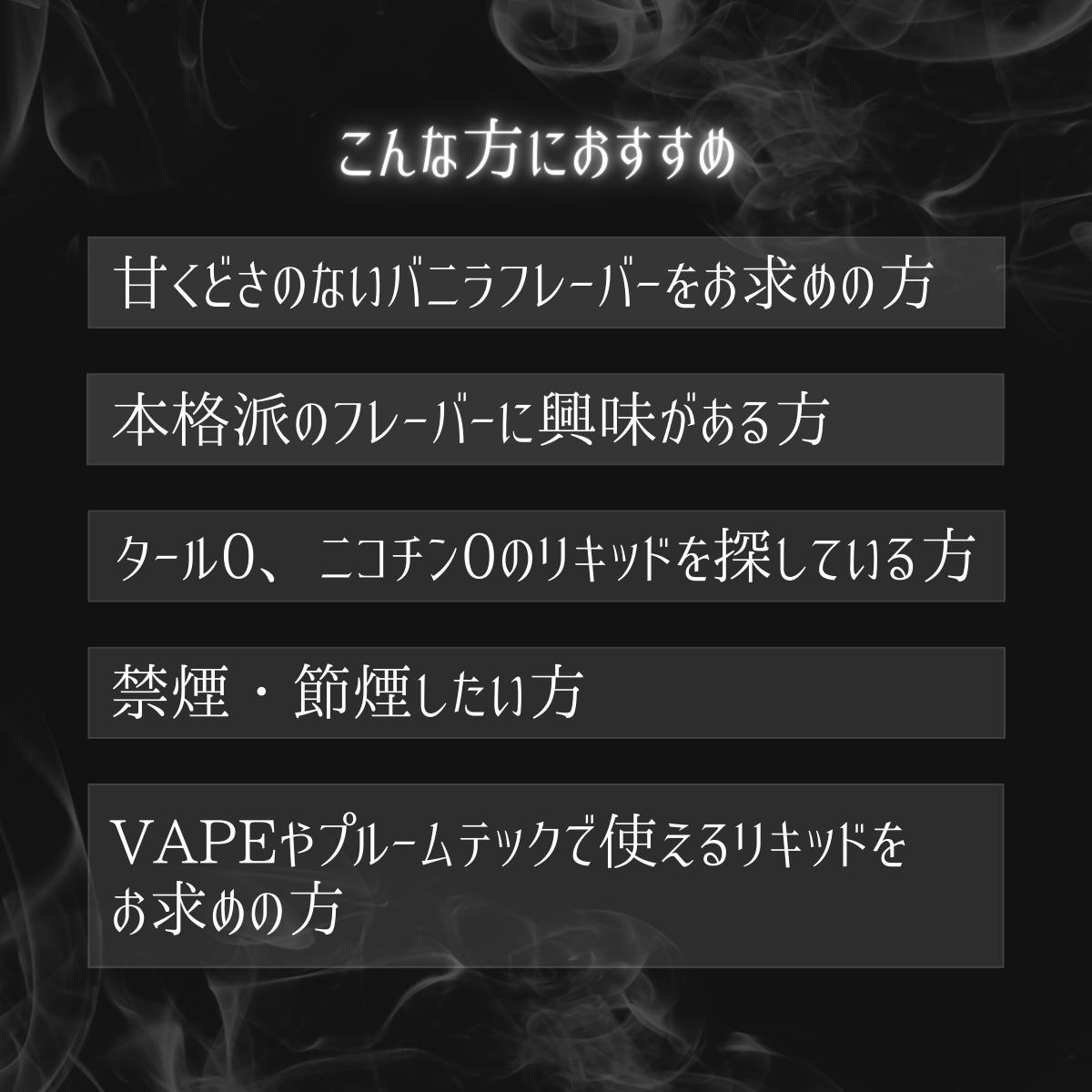 バニラ系特有の"甘くどさ"を抑え、一度ハマると癖になる吸いやすさを追求しました。