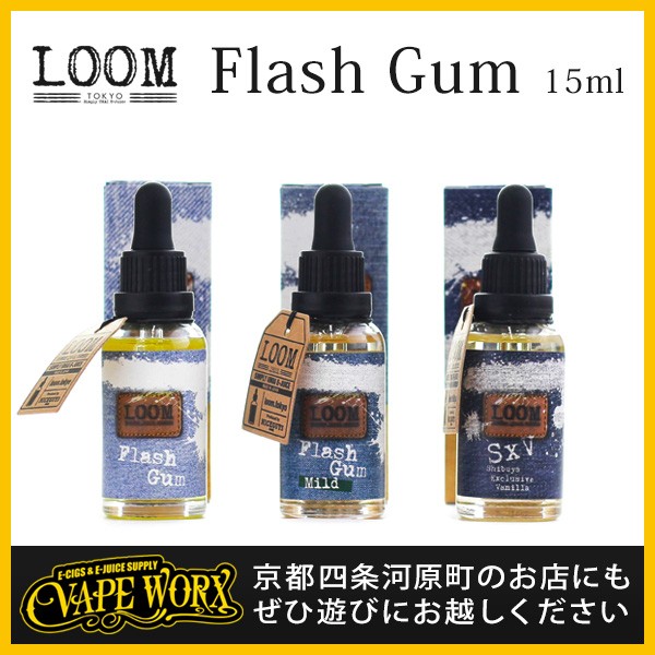 世界でも古くから愛され続けている生地のひとつ、デニム。そういったどんなライフスタイルにも合わせられる、最高な相棒に選ばれるもの。現代を生きる私達の生活に密着しているデニムのような存在でありたい。「 LOOM 」にはそんな想いが込められています。日本国内 ISO 9001 認証規格のクリーンルームにて生産されています。● Flash Gum (フラッシュガム)黒いガムとも緑のガムとも違う、VAPEだからこそ味わえるフラッシュガム!!食後や口元をスッキリさせたい時、全てをリフレッシュしてくれるこのフレーバーをお楽しみください。● Flash Gum Mild (フラッシュガム マイルド)刺激的な Flash Gum をマイルドにしました。リフレッシュしたい時以外でも日常的に楽しめるフレーバーです。我々日本人が古くから慣れ親しんでいる飽きない美味しさをお楽しみください。● Flash Gum EXTRA HARD (フラッシュガムエクストラハード)フラッシュガムシリーズ最強のメンソールです!普通のリフレッシュでは物足りない方や、煙量は求めていないけど刺激が欲しい、という方にピッタリです。今までとは全く切り口の違うミントがあなたの喉を刺激します!全てを吹き飛ばす最強メンソールを是非体感してください。