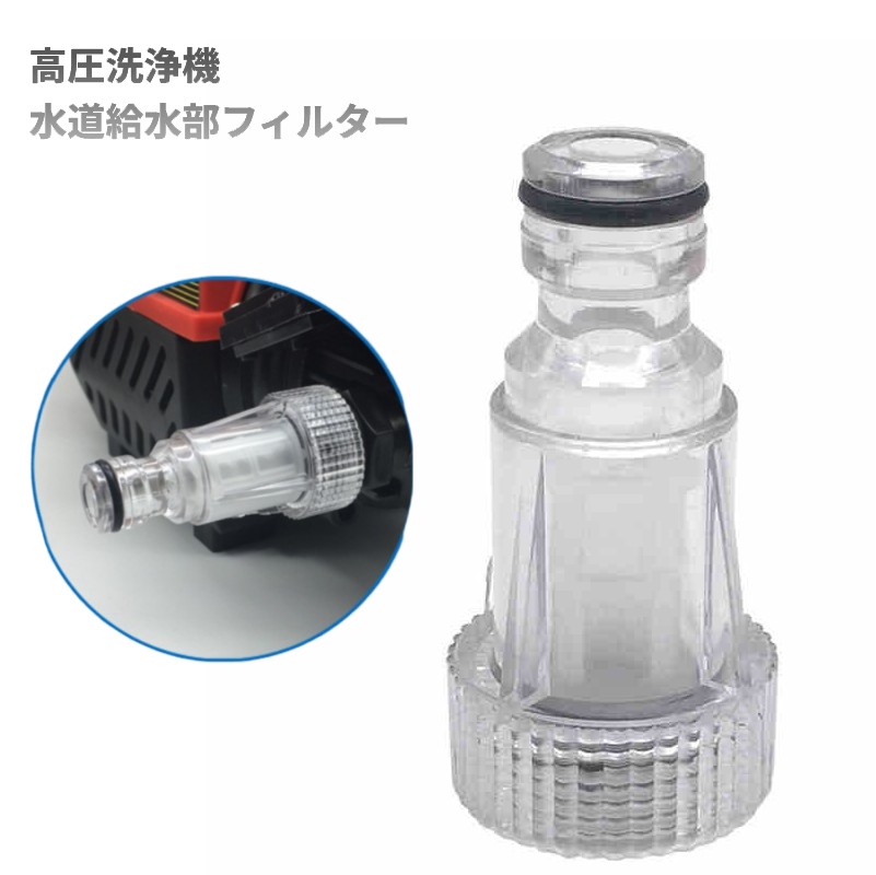透明フィルターのため、内部の汚れをすぐ確認できます。取り付けは給水口とホースコネクタに接続するだけで簡単。G3/4インチ規格で、ケルヒャー・リョービ・マキタ・ボッシュ・アイリスオーヤマなどの高圧洗浄機に対応します。