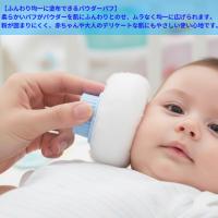 パウダーを入れて使える専用ボックス付きで、パフを清潔に収納可能。ホコリの舞い上がりを抑えながら使えるため、赤ちゃんのお世話にも便利です。使用時は、口・鼻・目に粉が入らないようご注意ください。
