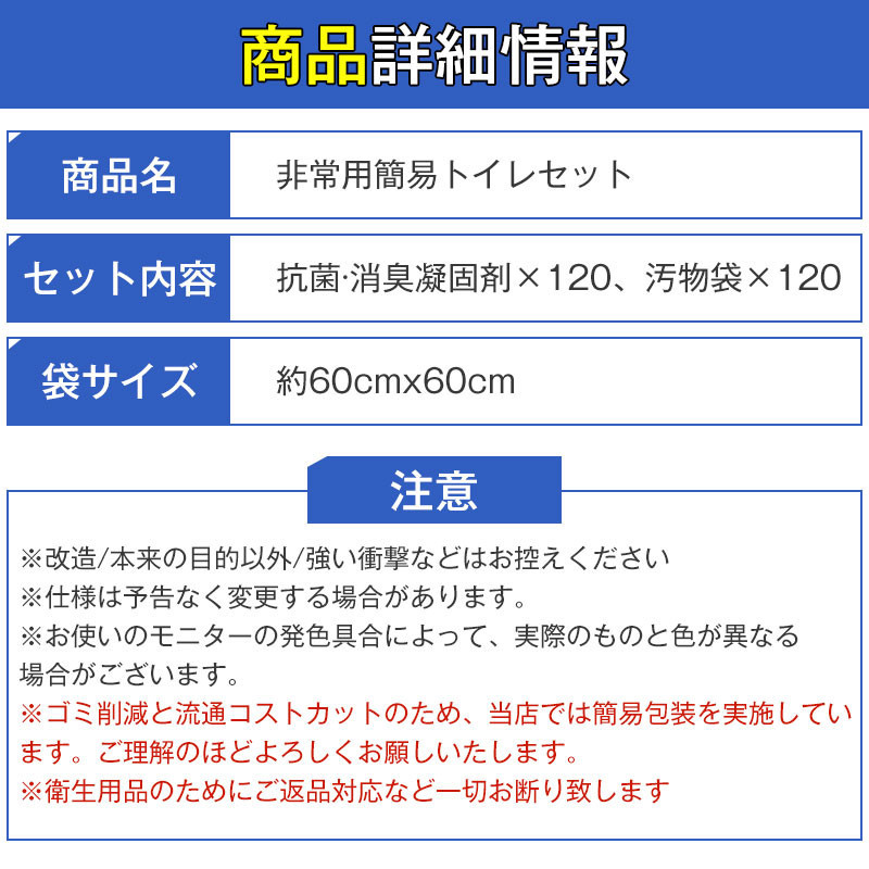 【商品内容】:非常用トイレ凝固剤×120、汚物袋×120、取扱説明書