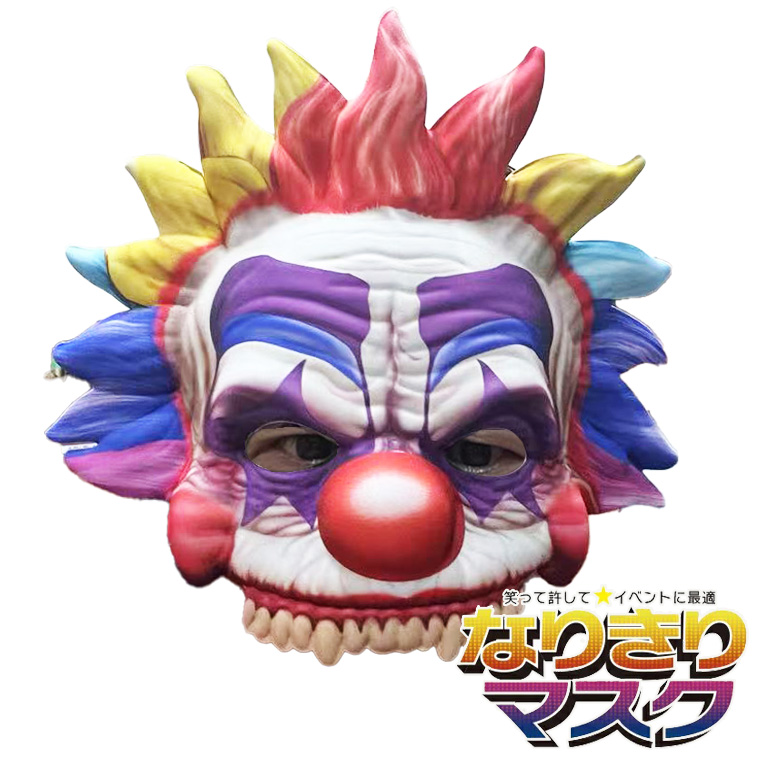 ・半顔でも強烈な存在感!カラフルな髪と赤鼻が特徴のホラーピエロマスク
