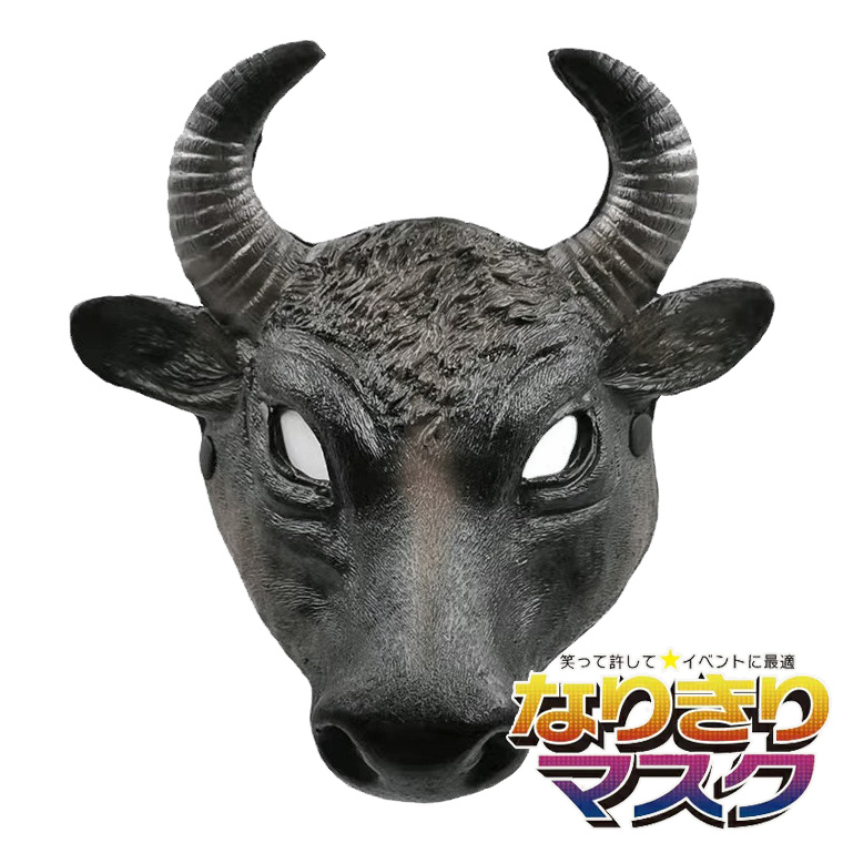 鋭い眼差しと屈強な角。迫力ある黒牛の顔をリアルに再現した半顔タイプのマスクです。力強く湾曲した角、立体的な毛並みのテクスチャー、深く彫り込まれた造形が相まって、見る者を圧倒する存在感を演出します。 目の部分は鋭く切れ込み、着用者の眼差しを強調。演劇やイベントで役柄の威厳や迫力を表現するのに最適です。