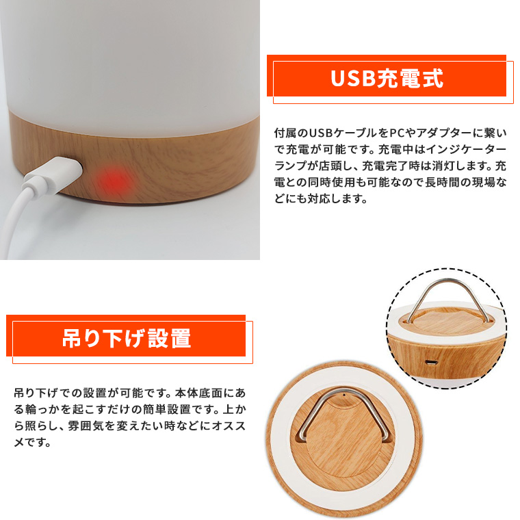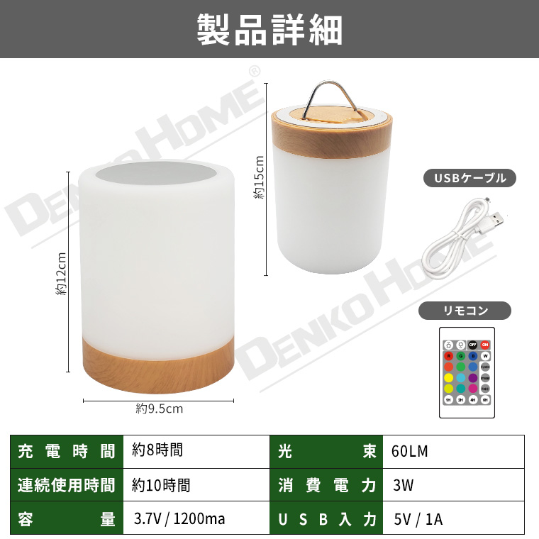 | 商品仕様 | | 商品名 | LED インテリアライト USB式 リモコン付 (i-light-nl18) | | サイズ(約) | 9.5×12cm (リング使用時高さ:15cm) | | 重量(約) | 210g | | フル充電時間(約) | 4時間 | | 連続点灯時間(約) | 10時間 | | バッテリー容量 | 3.7V / 1200mAh リチウムイオン電池 | | 光束 | 60LM | | 消費電力 | 3W | | USB入力 | 5V / 1A | | タイマー | 1H/2H/4H/6H ※サイクル機能有 | | 調光 | 5段階 | | 制御 | タッチ / リモコン | | 点灯パターン | 16パターン (常時点灯:13+パターン点灯:3) | | 製品素材 | ABS | | 商品内容 | 本体×1、USBケーブル×1、リモコン×1 | | 関連ワード | インテリアライト ナイトランプ ナイトライト タッチセンサー 木目 2way設置 モダン インテリア 手持ちライト 懐中電灯 |