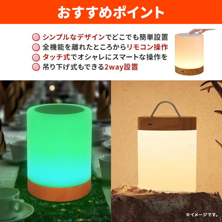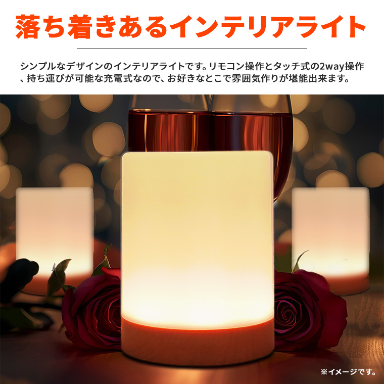 落ち着きあるインテリアライトシンプルなデザインのインテリアライトです。リモコン操作とタッチ式の2way操作、持ち運びが可能な充電式なので、お好きなとこで雰囲気作りが堪能出来ます。