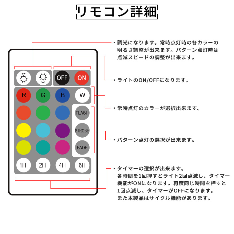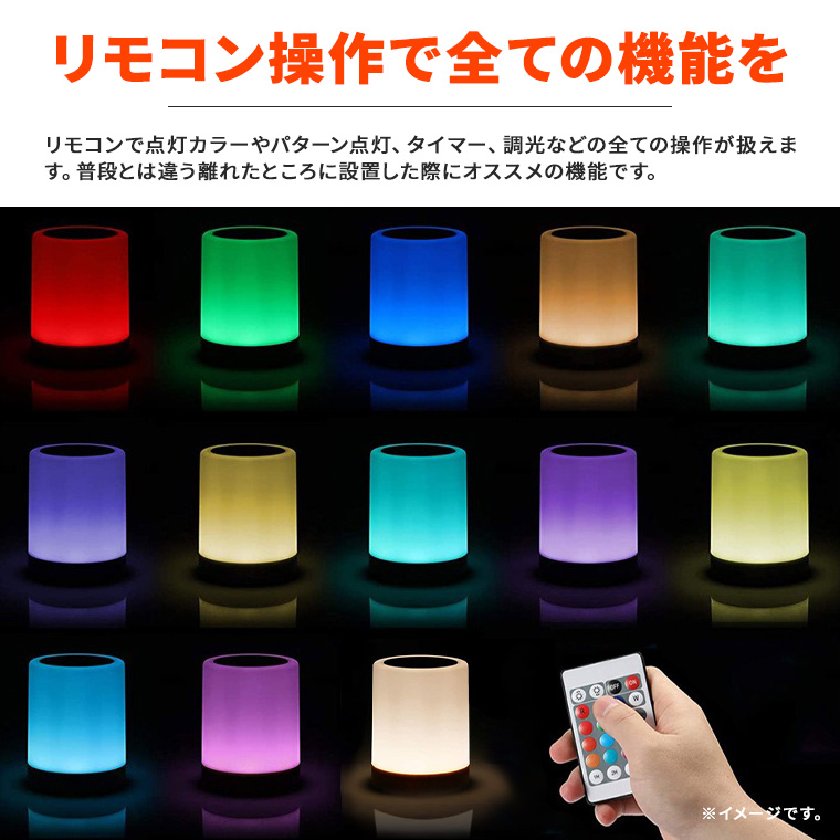 リモコン操作で全ての機能をリモコンで点灯カラーやパターン点灯、タイマー、調光などの全ての操作が扱えます。普段とは違う離れたところに設置した際にオススメの機能です。