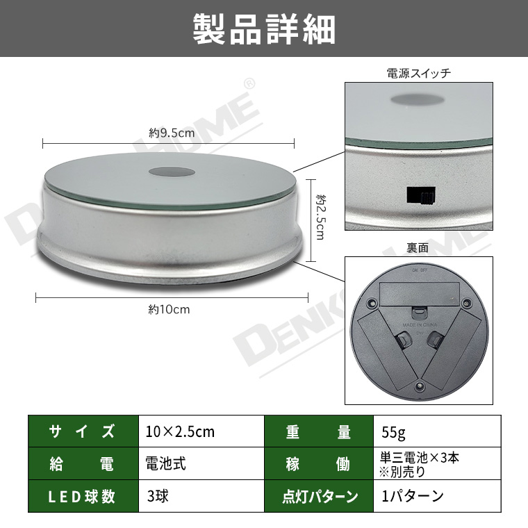 | 商品仕様 | | 品名 | LED台座 丸薄型 9.5cm 3灯 電池式 XSD-07 (kplsq-aa) | | サイズ(約) | 高さ2.5cm×幅10cm(上部:9.5cm) | | 重量(約) | 55g | | 素材 | ABS樹脂 | | 本体カラー | シルバー | | LEDカラー | マルチカラー(レッド、グリーン、ブルー) | | 点灯パターン | 1パターン | | 電源 | 単3電池×3(別売) | | 制御 | 本体スイッチ操作 | | 商品内容 | 本体×1 | | 関連ワード | 台座 光る 綺麗 フィギュア クリスタル ディスプレイ ステージ 花 展示 非回転 |