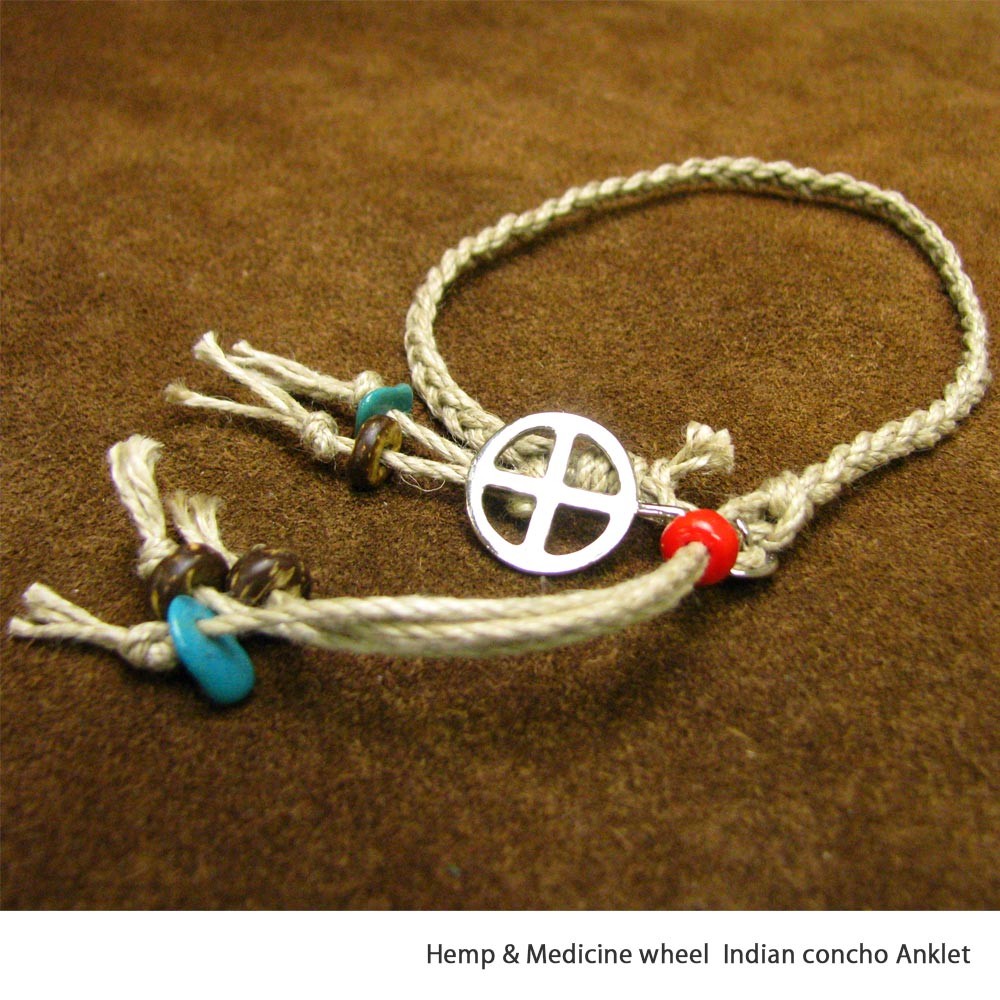 メディスン・ホイール(聖なる輪)インディアン コンチョ 天然ターコイズ&ココウッド エンド仕上げ ヘンプ(麻)編み込み アンクレット メンズ レディース 両対応