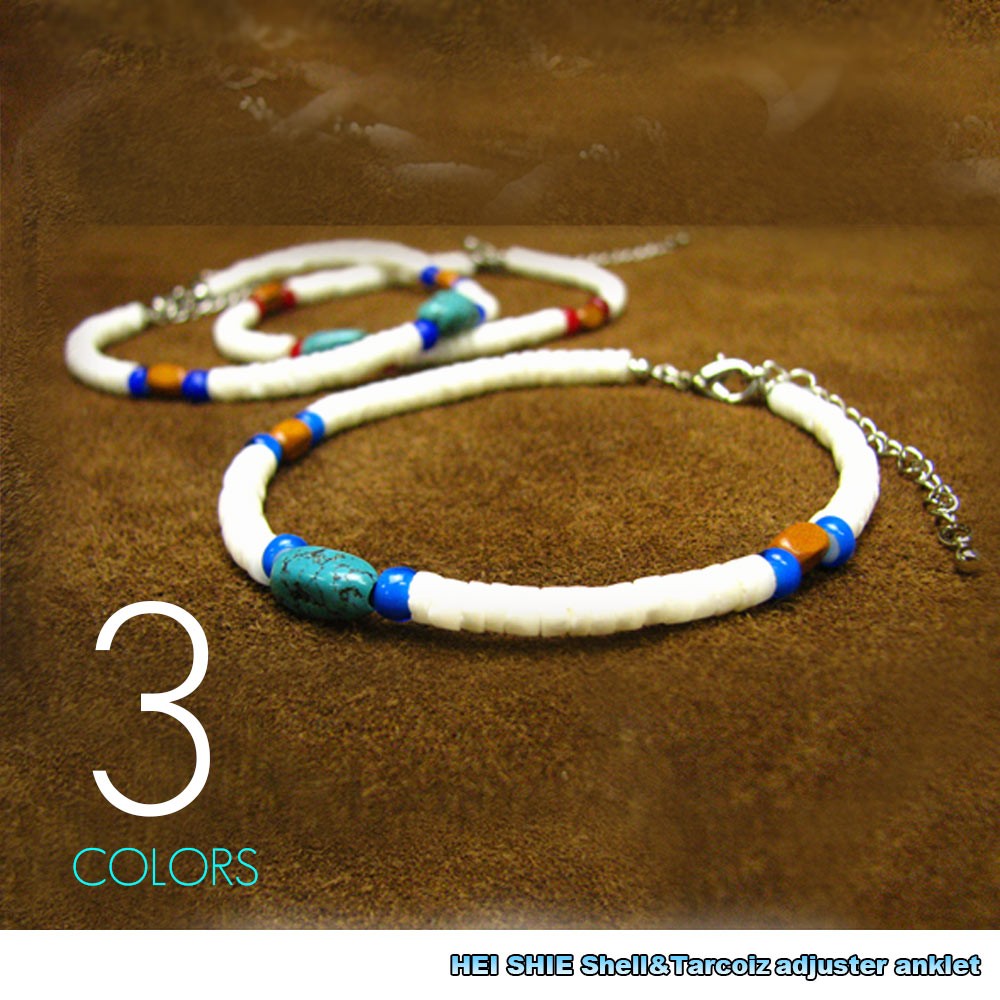 ハワイアンホワイトシェル(ヒーシー) 天然ターコイズ&コアウッド アジャスター付き アンクレット メンズ レディース 両対応