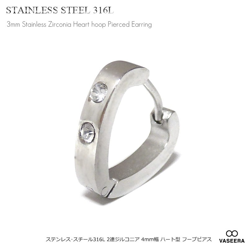 単品販売(一個) ステンレスピアス/ 3mm幅 2連ジルコニア埋め込み ハート型 フープピアス /メンズ レディース