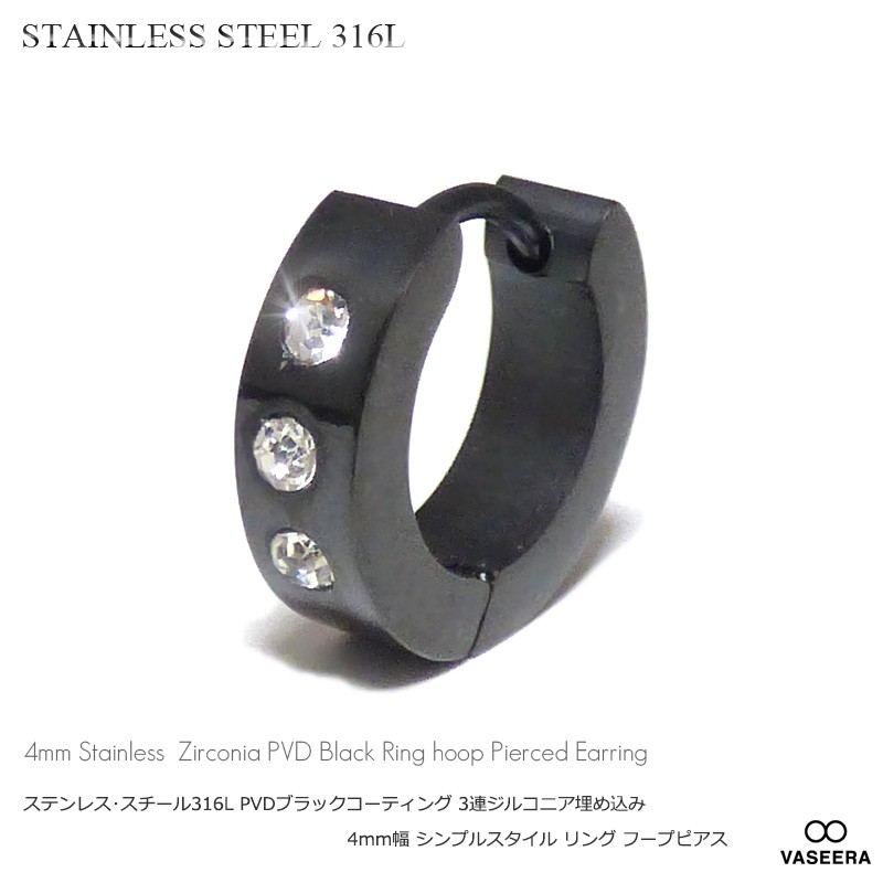 単品販売(一個) ステンレスピアス/ 4mm幅 PVDブラックコーティング仕上げ 3連ジルコニア埋め込み リング フープピアス /メンズ レディース