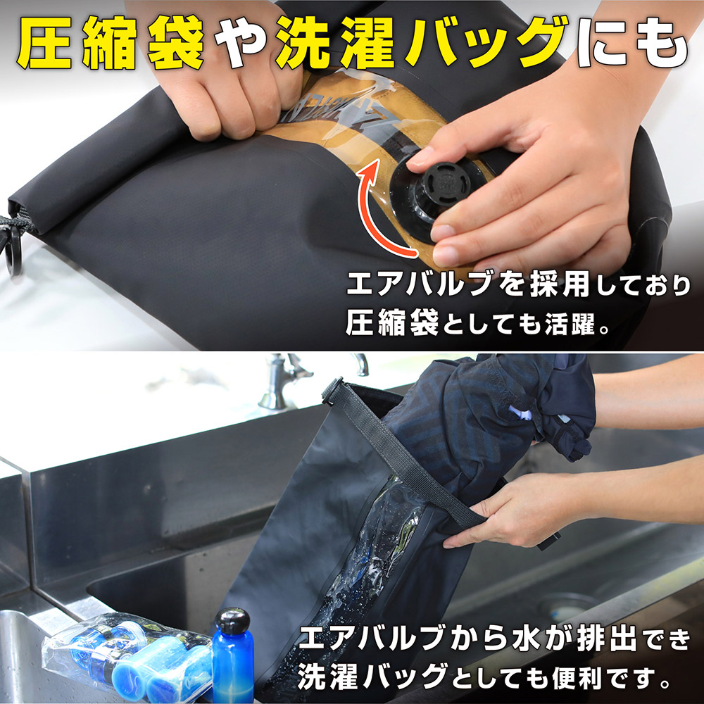 【エアバルブ】バルブを操作することでドライバッグ内の排気が可能。荷物が多いアウトドアシーンの「圧縮袋」としてご利用いただけます。バッグに水を入れるとバルブから水を出すことができ「ウォータータンク」や「洗濯バッグ」としても活躍します