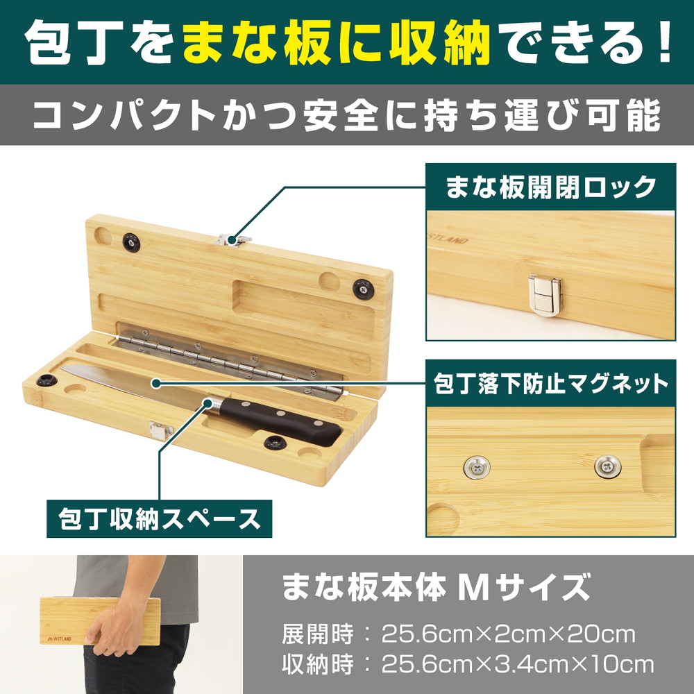 【コンパクトかつ安全】包丁をまな板に収納できるためコンパクト。さらに包丁収納スペースには落下防止マグネット、まな板には開閉ロック付きなので安全に持ち運び可能です。