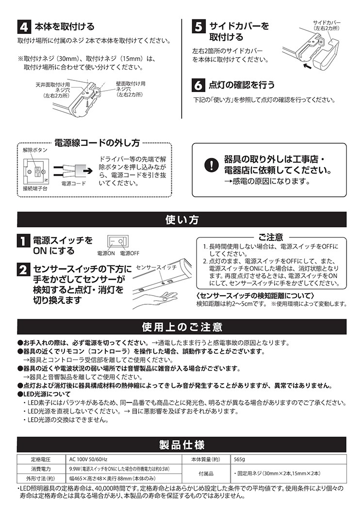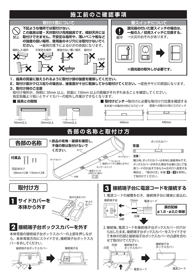 ※器具の取付けは説明書に従い確実に行ってください、取付けに不備があると火災・感電・落下によるけがの原因になります
