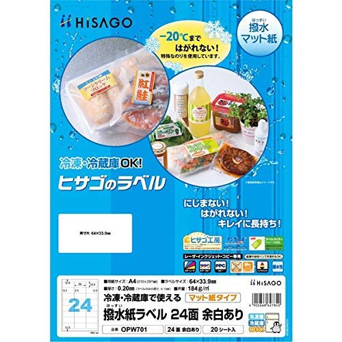 メーカー名:ヒサゴ(株)/【 特長 】/・上質紙に撥水加工を施した、水に強い撥水紙ラベルです。/・マイナス20度まではがれない特殊なのりを使用しているので、冷凍・冷蔵庫で保存するものに最適です。/・水滴が付いてもはがれたり破れたりしにくく、インクのにじみも少ないラベルです。/・油性ペンや鉛筆で手書きも可能です。/【 仕様 】/品名:ヒサゴ 撥水紙ラベルA4 24面余白あり/品番:OPW701/面付:24/ラベルサイズ(mm)縦:33.9/ラベルサイズ(mm)横:64/シートサイズ:A4(210×297)/紙厚さ(mm):0.20mm(ラベルのみの厚さ:0.10mm)/坪量:184g/m2/シートサイズ:A4(210×297)/レーザプリンタ・コピー機の他、全色顔料インク専用(染料系インクには対応しておりません)のインクジェットプリンタ対応/【 材質/仕上 】/撥水紙/質量:265g/JANコード:4902668627840/【 注意 】/●インクジェットプ