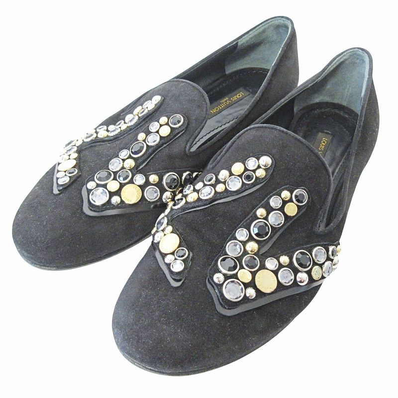 ルイヴィトン LOUIS VUITTON 美品 ビジュー オペラ フラット ぺたんこ シューズ スリッポン モカシン スウェード 36.5 23.5cm ブラック