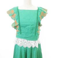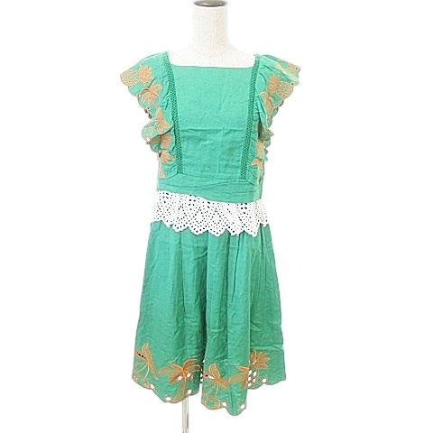 チェスティ Chesty 美品 エンブロイダリー セットアップ リネン混 刺繍 レース トップス スカート パイナップル柄 フリル 0 約XS 緑 グリーン IBO49 レディース
