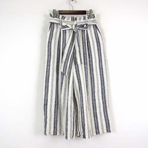 コムサマチュア Comme ca Mature ガウチョパンツ ワイド スカーチョ 麻 リネン ウエストリボン マルチボーダー柄 L 11 オフ白 グレー