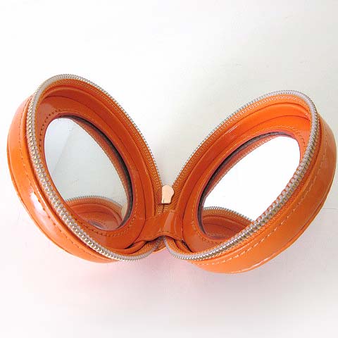 未使用品 フォリフォリ Folli Follie 化粧ポーチ コスメポーチ 小物入れ 鏡 ミラー ラウンドジップ エナメル オレンジ 美品