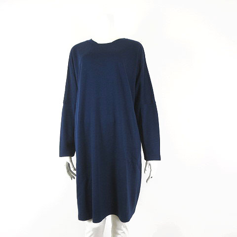 Cross Point クロスポイント 日本製 ゆったり ニット ニットソー チュニック ウール混 変形襟 ドルマンスリーブ 長袖 L 紺 ネイビー