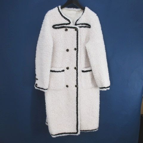 ロング丈 ボア ノーカラーコート M 白系 ホワイト ダブルボタン ポケット レディース