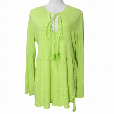 ALLUDE アリュード リネン 長袖 チュニック カットソー キーネック タッセル S ライムグリーン IBO72 X レディース