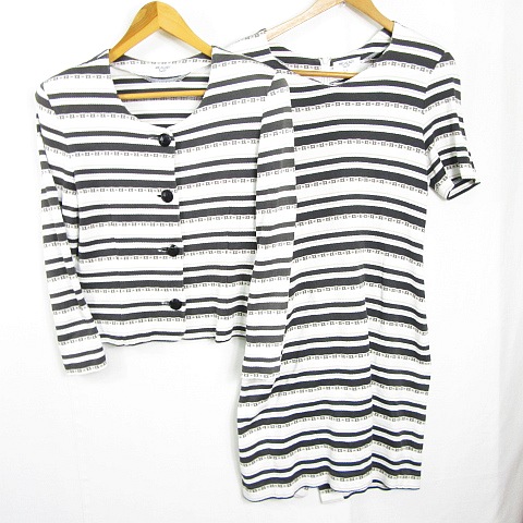 ミカレディ MICALADY セットアップ ジャケット ワンピース ヴィンテージ 半袖 膝下丈 肩パッド 綿 M ホワイト ブラック ボーダー 総柄 kz11599 レディース