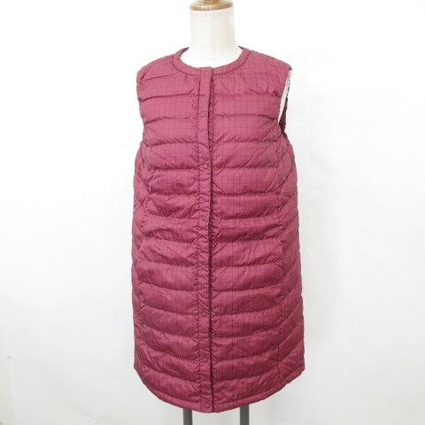 未使用品 トップバリュ TOPVALU ベスト ダウンベスト ノーカラー ロング はっ水 収納袋 チェック ボルドー 黒 M レディース