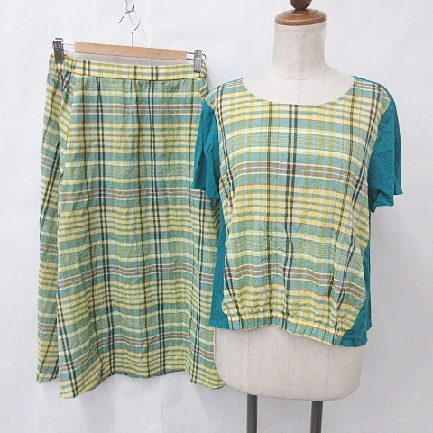 タバサ TABASA セットアップ ブラウス プルオーバー 半袖 異素材切替 チェック 無地 フレアースカート ロング イエロー グリーン ブルー